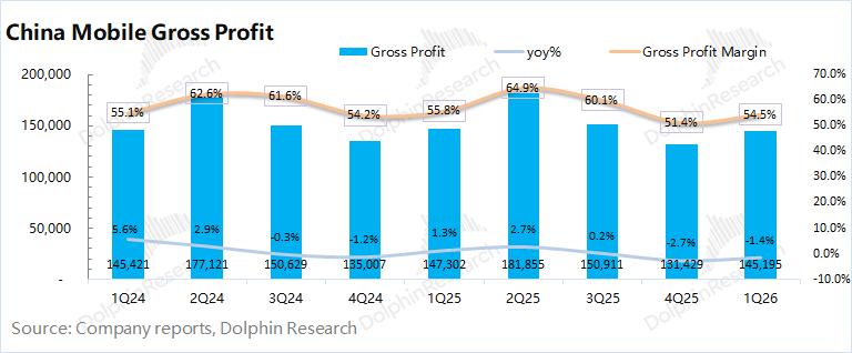 中国移动2026年第一季度毛利率54.5%,同比下降1.3pct。海豚君将“网络运营及支撑成本”和“销售产品成本”列为营业成本,进而测算公司毛利及毛利率情况。