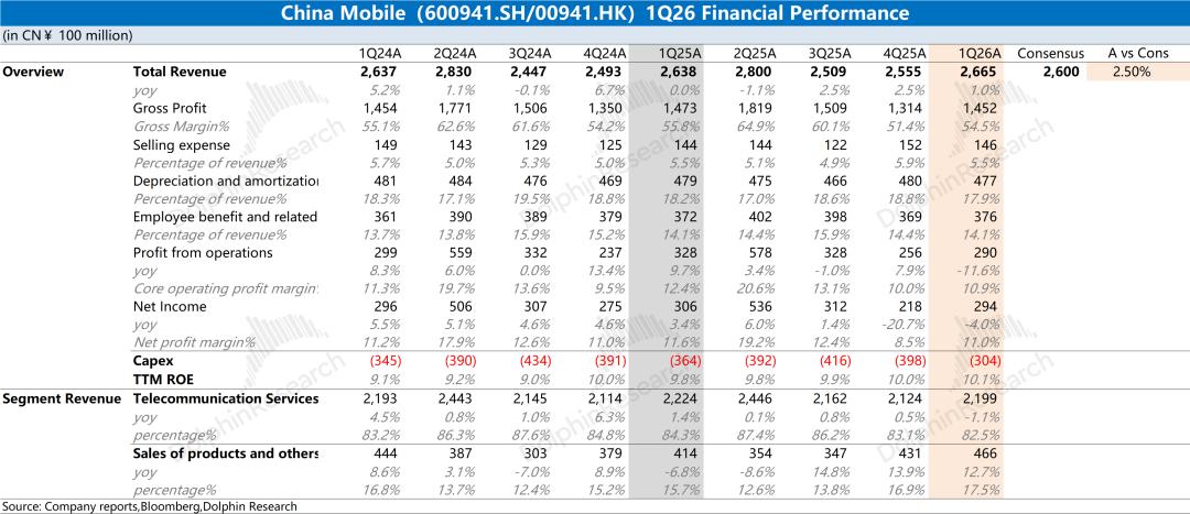 中国移动(600941.SH/00941.HK)于北京时间2026年4月20日晚的港股盘后发布了2026年第一季度财报(截止 2026年3月),要点如下: