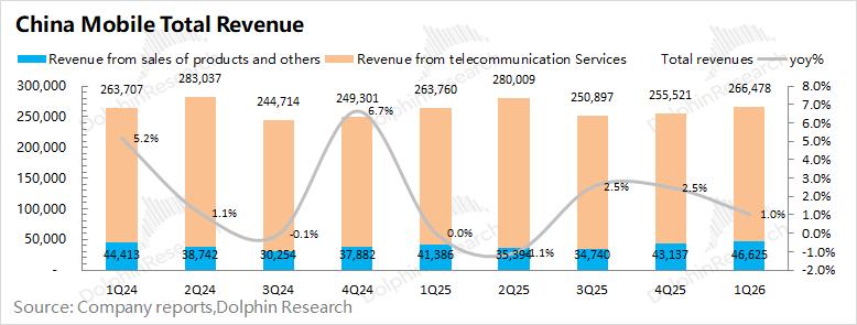 中国移动2026年第一季度总营收2664.8亿元,同比增长1%。分项来看,其中公司本季度来自于通讯服务的收入为2198亿元,同比小幅下降1.1%;来自产品销售及其他的收入为466亿元,同比增长12%,是公司本季度增长的主要推动力。