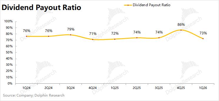 b)分红情况:公司本季度分红197亿元,由于之前主要是在二三季度进行分红。假定公司在二季度分红280亿元,那么公司当前的股息支付率仍将维持在73%左右。