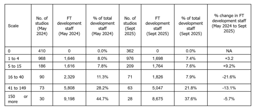 报告显示,中型团队成为本轮收缩中受冲击最严重的一环:员工规模在16至40人的工作室,开发人员数量下降21.6%(减少503人);41至149人的团队则下降13.1%(减少761人)。相比之下,员工规模超过150人的大型工作室仅下降5.7%(减少523人),表现出更强的抗风险能力。