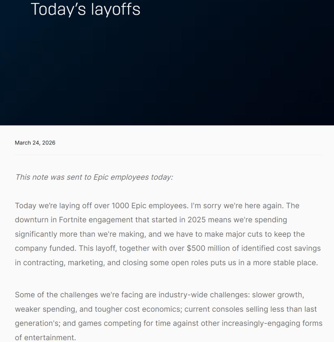 在海外市场,头部厂商的收缩同样明显。Playtika在2026年初裁员约500人,并明确提出将“利用AI提高效率”;Epic Games则在3月宣布裁员超过1000人(约占员工总数20%),并同步削减超过5亿美元成本,以应对《Fortnite》自2025年以来的用户与收入压力。