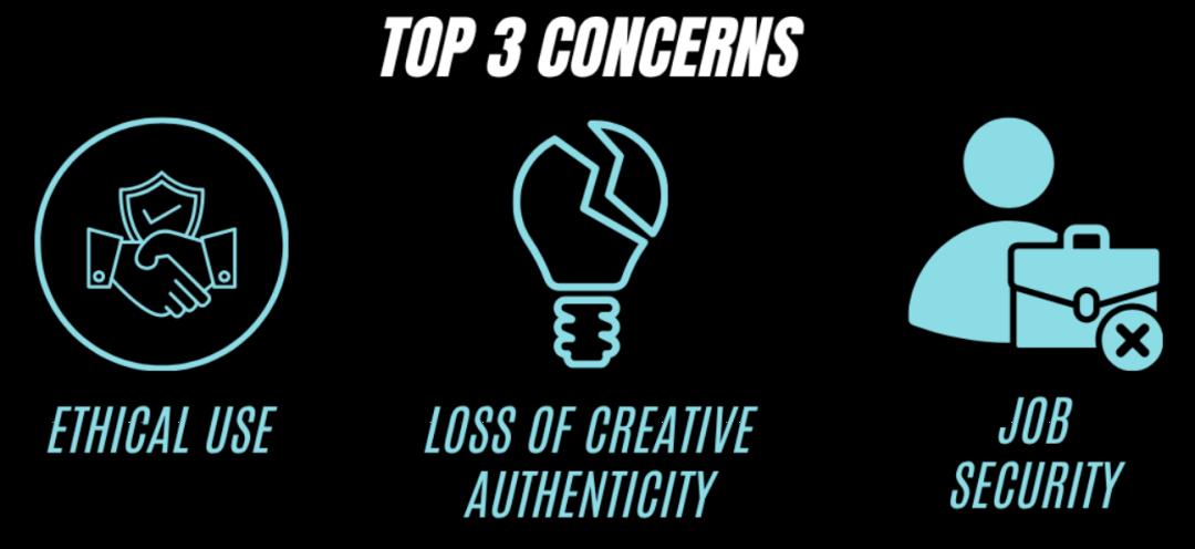 但另一方面,围绕AI的核心焦虑并未消失,反而在裁员背景下被进一步放大。调查显示,从业者最关心的三个问题,依次是岗位安全、创作真实性,以及AI的伦理使用边界。