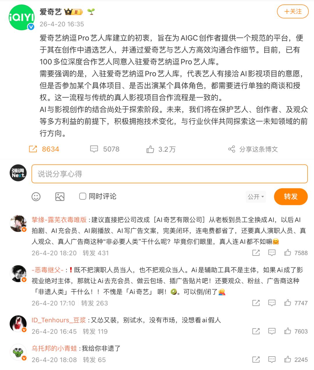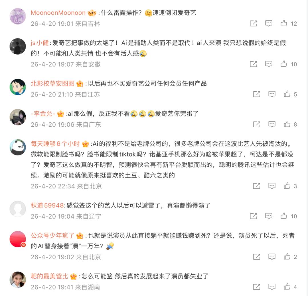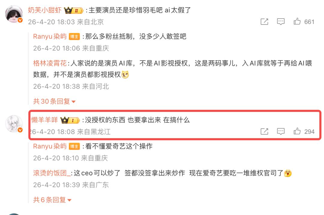 这不是咬文嚼字的问题。从微博网友评论可以看出,当爱奇艺方面在台上用“签约”的语气列出117位艺人姓名时,在场媒体和台下观众接收到的信息,是“这些艺人同意了AI复制其形象”。
