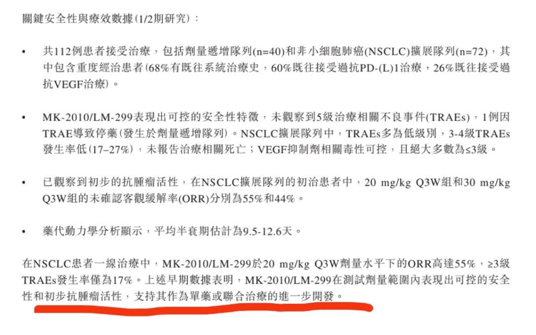 作为PD-1/VEGF双抗的标杆产品,依沃西单抗此前公布的NSCLC一线数据ORR为50%,mPFS 11.14个月,显著优于K药。目前已进入多项III期注册临床,商业化步伐激进。但对比可见,LM-299的ORR(55%)更高,且≥3级不良反应率更低,单药疗效-安全性比更具优势,同时双抗结构的差异化设计,也让其在联合用药开发中具备更大潜力。