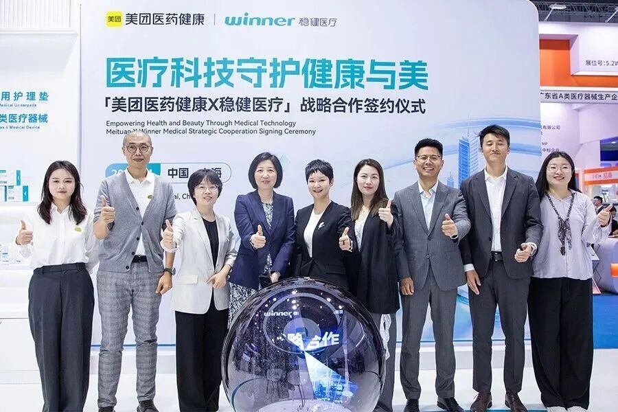 先看看美团的动作,在博览会上,美团医药健康一举与稳健医疗、可孚医疗、海氏海诺、三诺生物、鱼跃医疗五大头部品牌达成战略签约,依托其覆盖全国的25万家药店与4400余个闪电仓,构建起“平均22分钟送达”的即时履约网络。