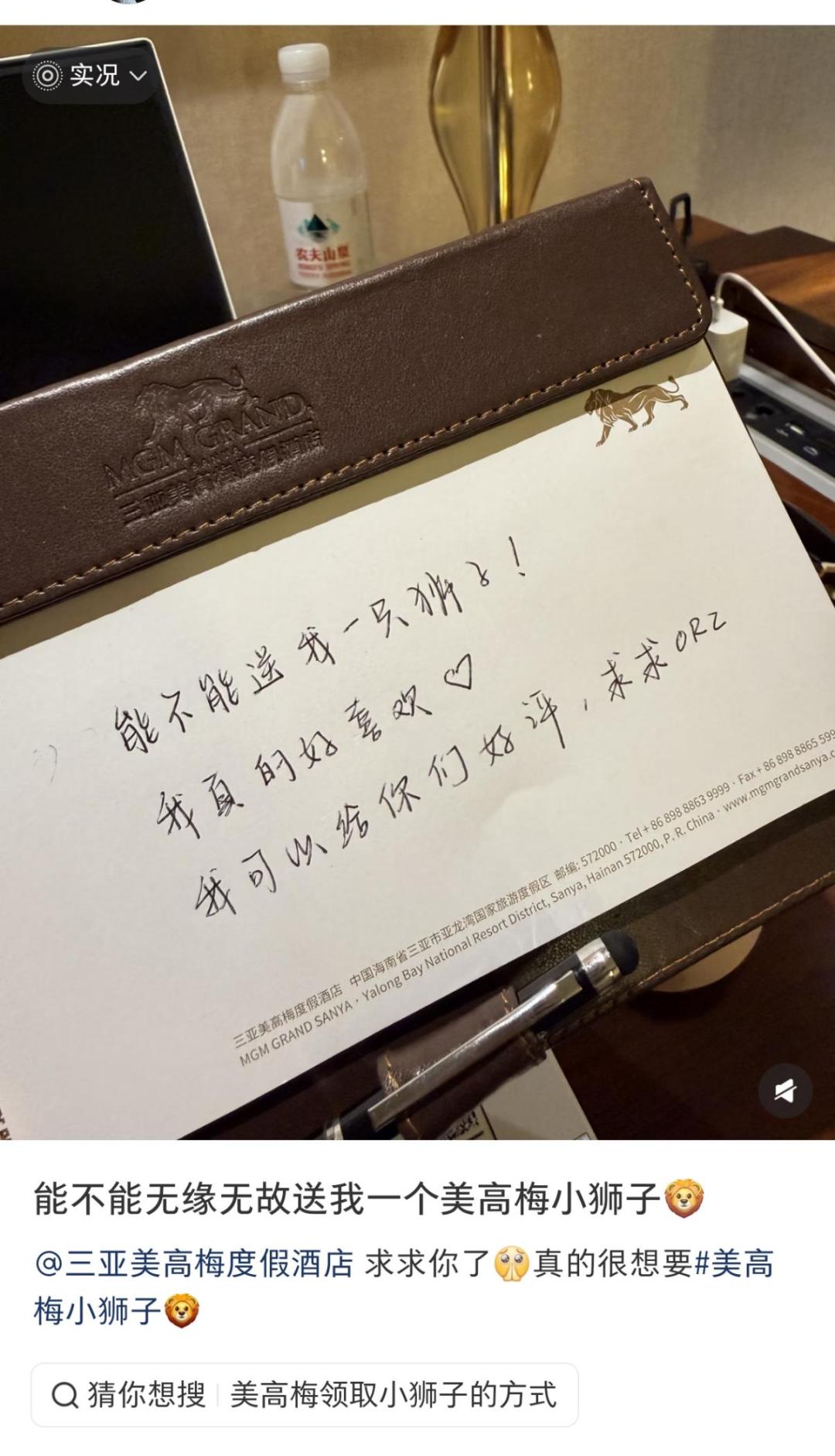 《酒管财经》就注意到,曾有用户喊话某美高梅酒店,“能不能送我一只狮子!我可以给你们好评,求求ORZ”。