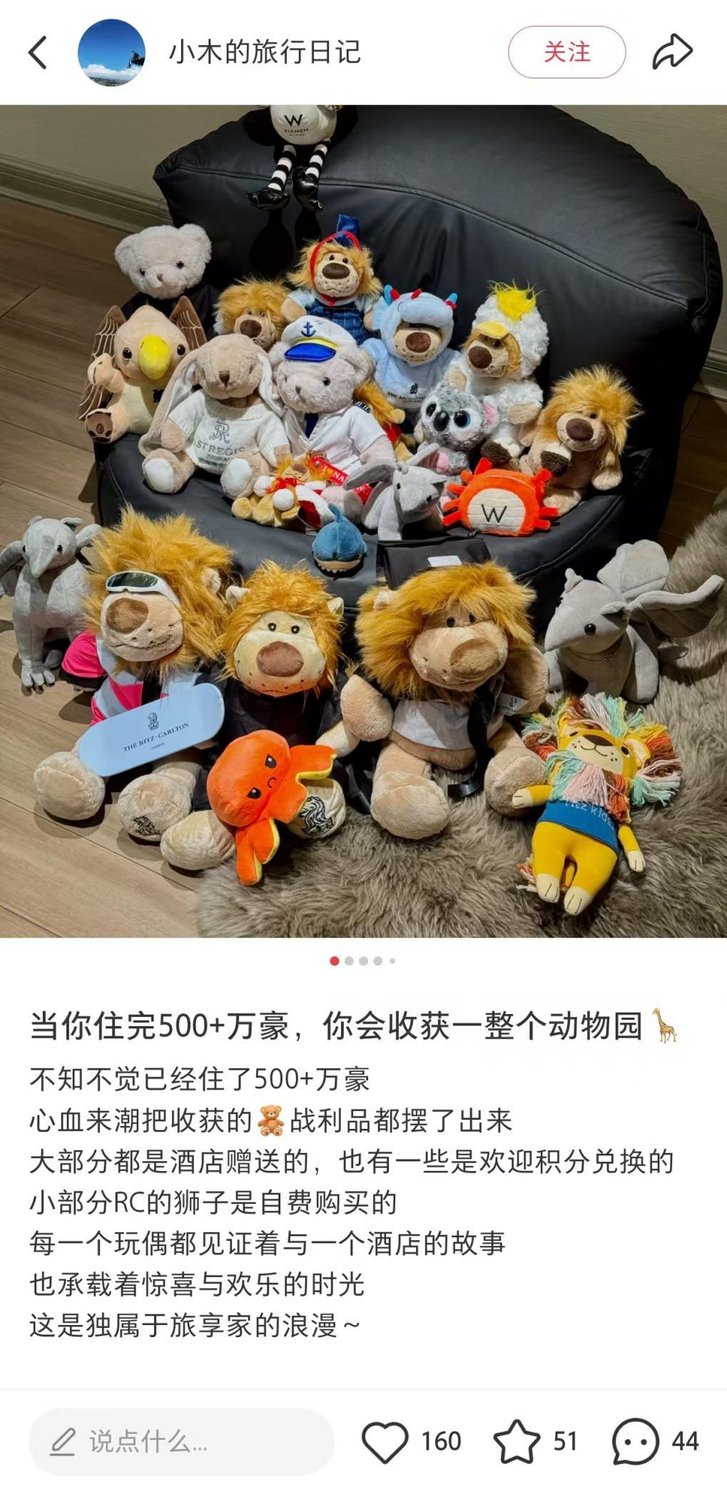 小红书用户在平台分享称,“当你住完500+万豪,你会收获一整个动物园。”而下面的回帖纷纷咨询该类玩偶的获得方式。