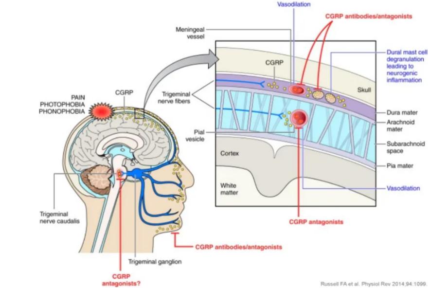 图:CGRP抑制剂作用机制,来源:《生理学评论》