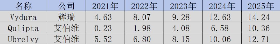 三款CGRP小分子拮抗剂——艾伯维的乌布吉泮(Ubrelvy)和阿托吉泮(Qulipta),以及辉瑞的瑞美吉泮(Vydura)销售额分别达到12.71亿、10.36亿和14.24亿美元,同比大幅增长26.34%、57.45%及12.75%,集体跻身“十亿美元分子”行列。