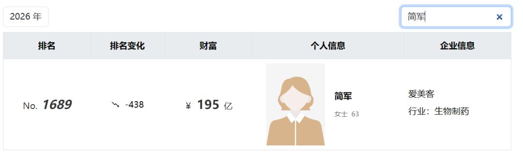 从41岁跨界入行,到身家超过五百亿,她走了十七年。但从峰顶滑落,却只用了不到四年,胡润全球富豪榜上,2026年简军的身家已经缩水至195亿元。