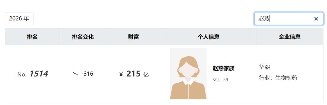 如今,在胡润榜单上,赵燕家族的财富从2021年的650亿跌到了2026年的225亿,蒸发425亿,排名从240名滑到1198名。