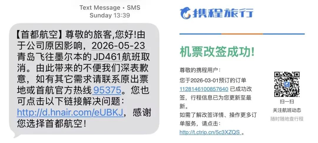 当标准客服通道失效,旅客只能靠“非常规路径”自救,或被迫接受不对等的妥协。22岁的杨昕月持打工度假签证在墨尔本肉厂做包装工,半年未归家。3月初,她以1200元订下首都航空青岛飞墨尔本的返程票。4月19日周日,她在家休息时突然收到取消短信。航司客服热线一小时未通,她在民航局12326平台提交投诉。