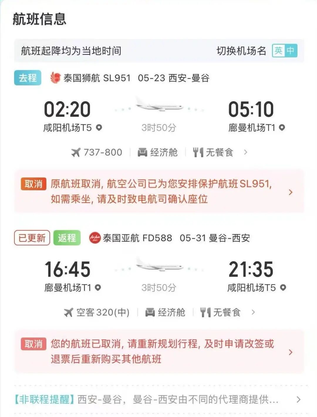 ● 赵华瑞一家西安往返曼谷的两趟航班均已取消。图源:受访者