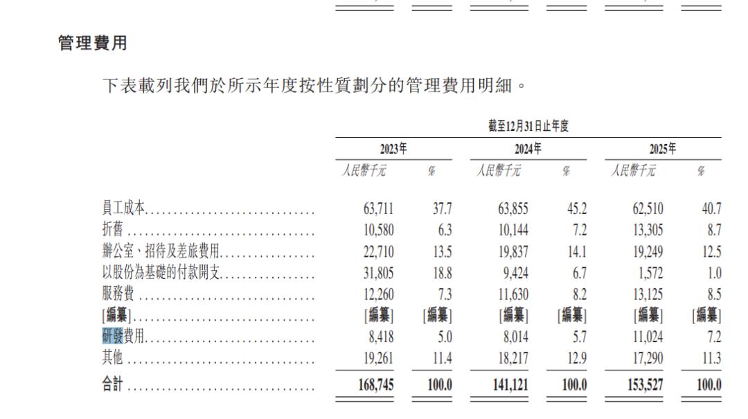 但作为更名为“营养科技”的企业,宜品的研发投入占比却连续三年不足 0.6%。招股书中,宜品营养科技将研发费用归到行政开支大类下面,2023年到2025年,研发费用分别为841.8万元、801.4万元、1102.4万元,在营收中的占比分别为0.52%、0.45%、0.59%。