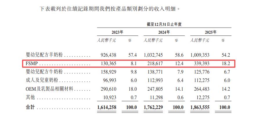 截至2025年底,宜品以4.5%的份额杀入国内整体前五。数据显示,宜品FSMP业务收入从2023年的1.30亿元狂飙至2025年的3.39亿元,营收占比从8.1%升至18.2%;2025年该业务毛利率为74.7%。