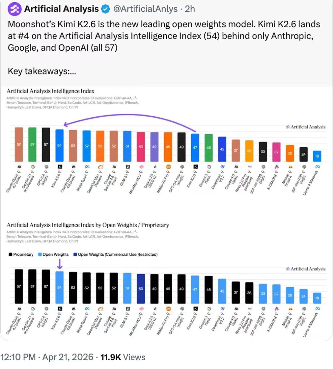 Artifacial Analysis智能榜单,Kimi K2.6仅次于三家闭源模型,并领跑开源模型权重榜单