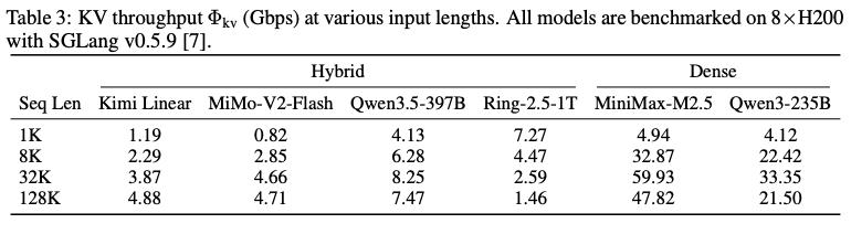 为了证明混合模型架构的优势,论文提到一组实验:8卡H200和SGLang v0.5.9推理框架下,对多款主流模型进行基准测试,32K上下文长度时,采用混合注意力的MiMo‑V2‑Flash模型KV 吞吐量仅4.66Gbps,而同规模稠密注意力模型MiniMax‑M2.5高达59.93Gbps,直接证明混合注意力架构可将KV缓存传输需求压至普通以太网可承载范围。