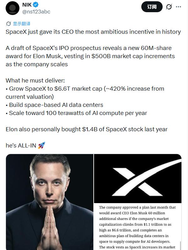 根据The Information获取的招股文件,SpaceX董事会上个月批准了一项计划:如果公司市值从1.1万亿美元攀升至6.6万亿美元,并且完成在太空建设数据中心的计划,马斯克将获得额外6000万股股票。随着市值每增加5000亿美元,这些股票就会分批归属。