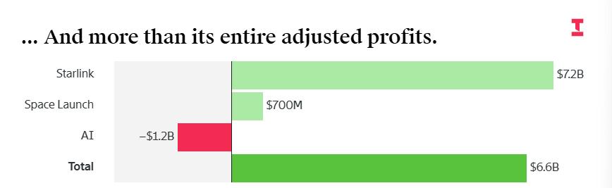 但问题在于,这点钱远远不够填补另外两个部门的窟窿。火箭发射业务按照同样口径计算的自由现金流为负30亿美元,人工智能业务更是一年烧掉近140亿美元现金。三项业务加总,SpaceX整体的自由现金流为负140亿美元。