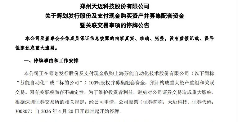 4月20日,郑州天迈科技股份有限公司(以下简称:天迈科技)发布停牌公告,拟通过发行股份及支付现金的方式,收购上海芬能自动化技术股份有限公司(以下简称:芬能自动化)100%股权并募集配套资金,预计构成重大资产重组和关联交易。