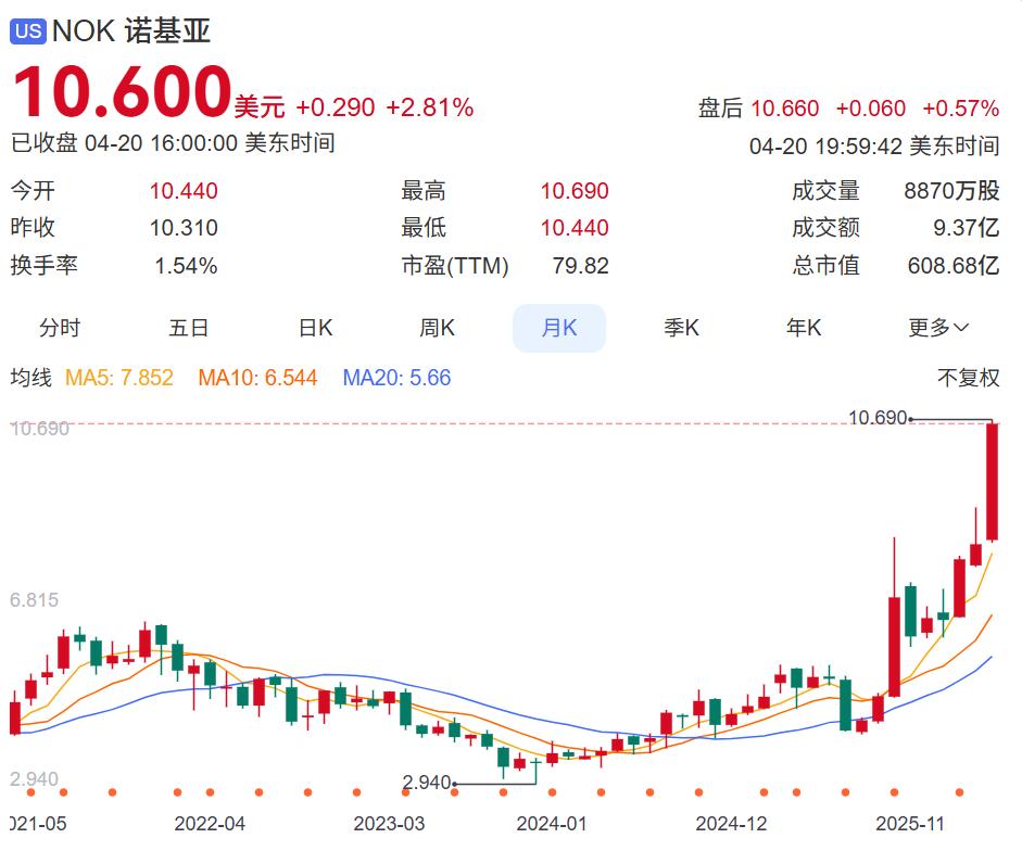 所以这几天关于诺基亚的新闻再次出现时,很多人感觉很惊讶:诺基亚股价创16年来新高,市值已突破600亿美元(合人民币近4000亿元),年内涨幅超60%!