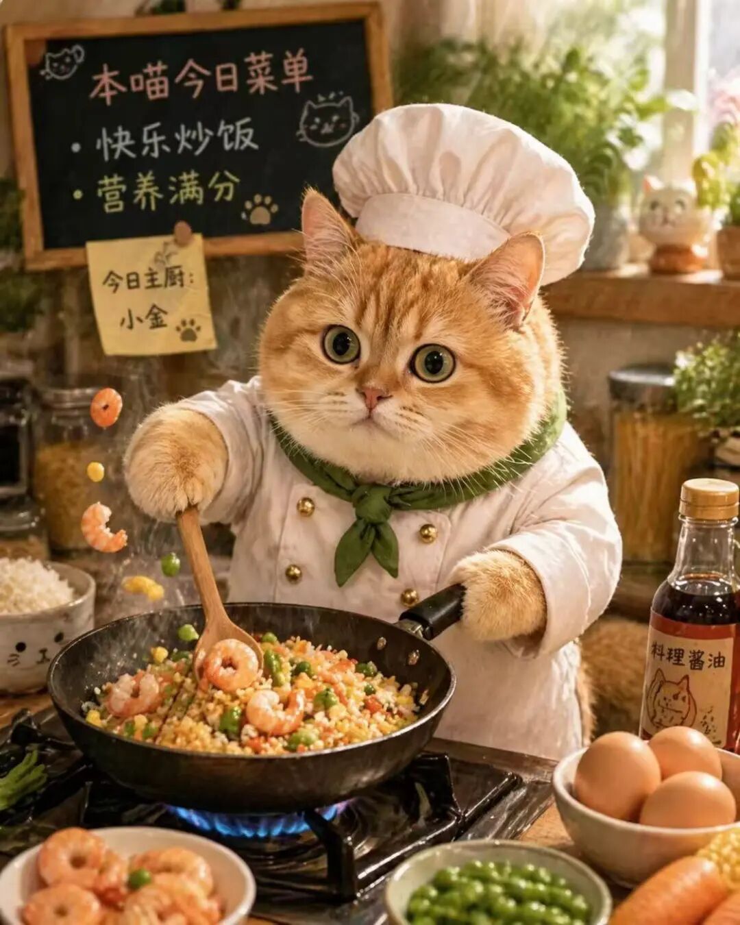 下图就是作者用小猫照片生成的一张带有中文字的图片,它甚至自主给小猫取了中文名:小金。图中文字去嗯对,没有错别字。但图片精致程度和官方照片显然也差一个量级。