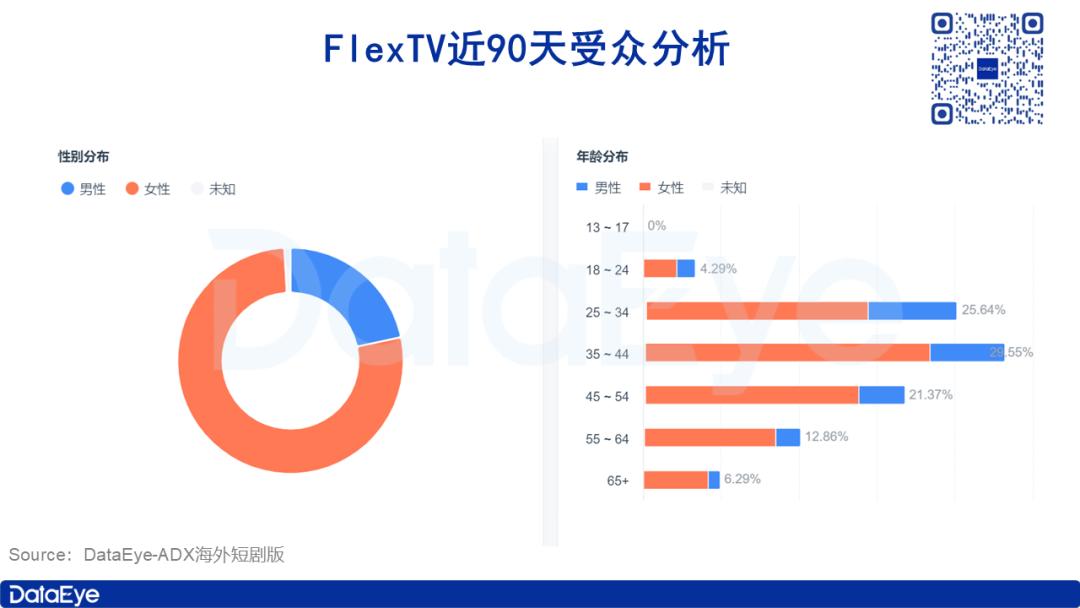 从受众画像来看,近90天,FlexTV以女性受众为主,女性用户占比高达77%,男性用户仅为23%。年龄层面上,FlexTV整体用户偏年轻化,25至44岁群体占比过半,44岁以下年轻用户合计占比约六成。