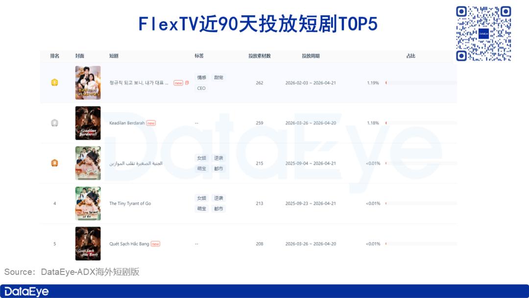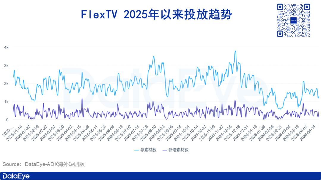 根据DataEye-ADX数据,FlexTV 2025年全年投放了超9万组素材,投放力度整体呈震荡上行走势,日均投放素材量超2000组,但2026年以来投放力度大幅下降,日均投放素材量下滑至1200组左右。