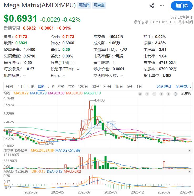资本市场层面,MPU当前市值已回落至4713万美元,股价较巅峰时期4.4美元大幅回落,近乎腰斩。