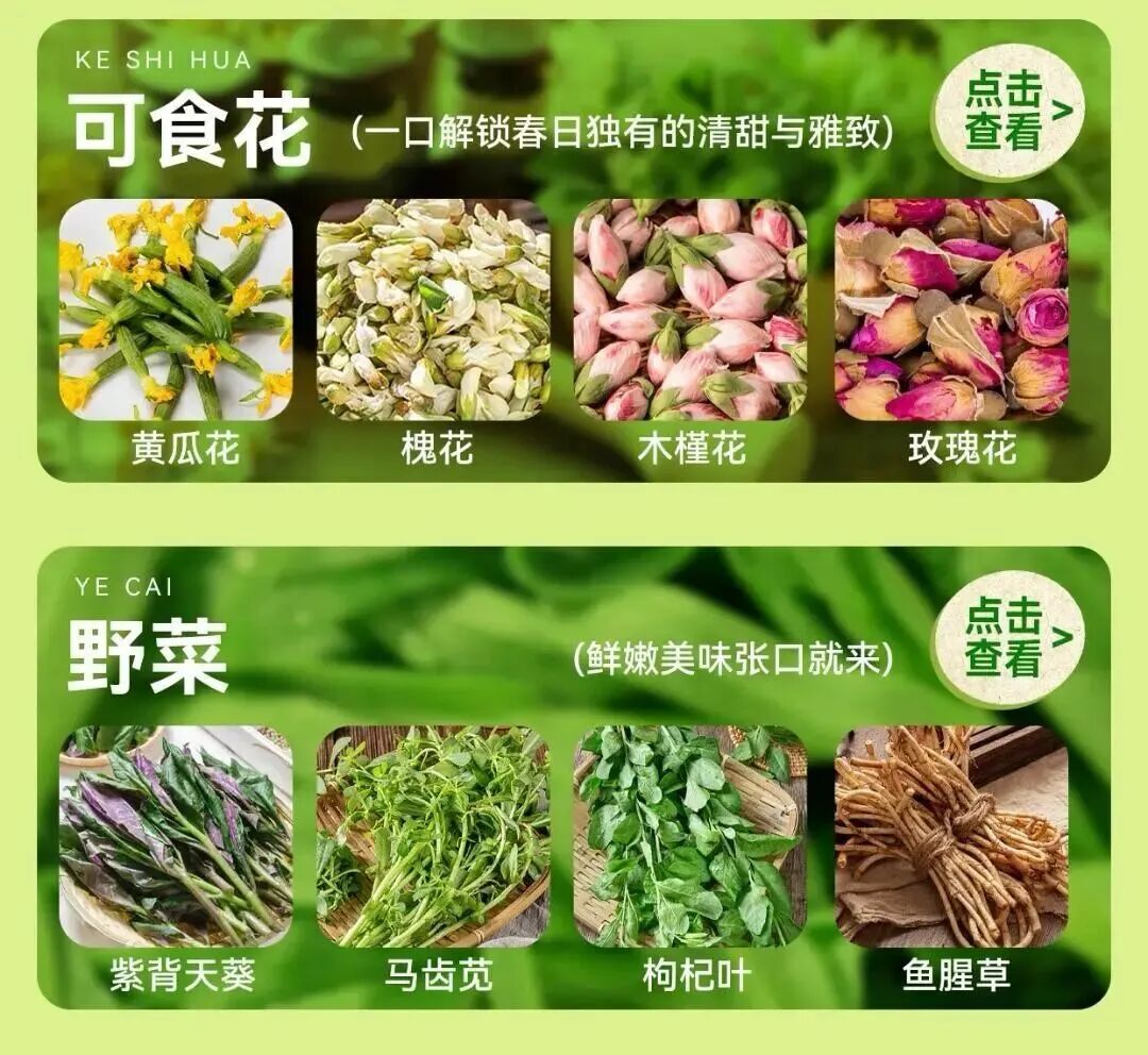 盒马今年的春菜清单堪称“植物图鉴”:鲜食玫瑰花、茉莉花、地衣、板蓝根青菜、大理海菜(金雀花)、枸杞芽、丝瓜尖……