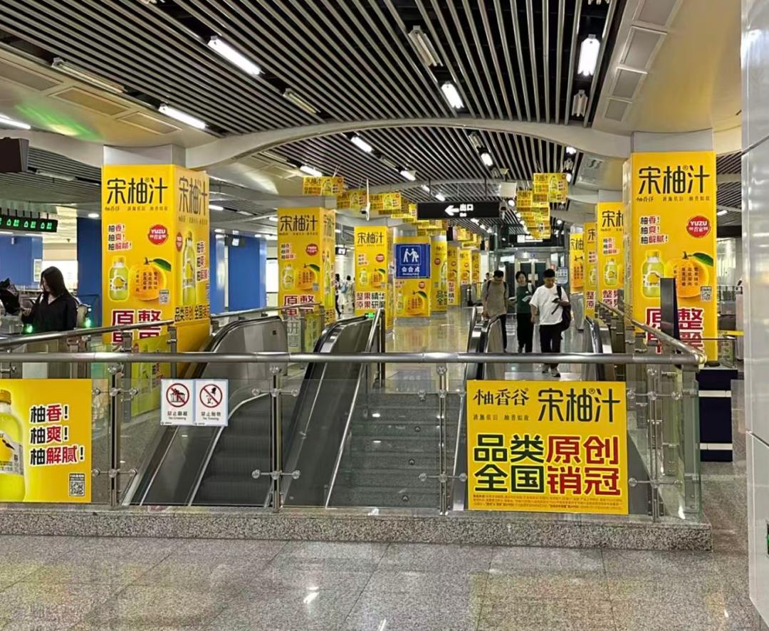 在线上,罗永浩等头部主播,带货过宋柚汁。在线下,宋柚汁近乎覆盖国内商超、便利店等主流消费渠道;从地铁站、高铁站、巴士车身,再到写字楼的电梯数字屏,出门的每一步,似乎都能看到宋柚汁那一张黄橙橙的海报。