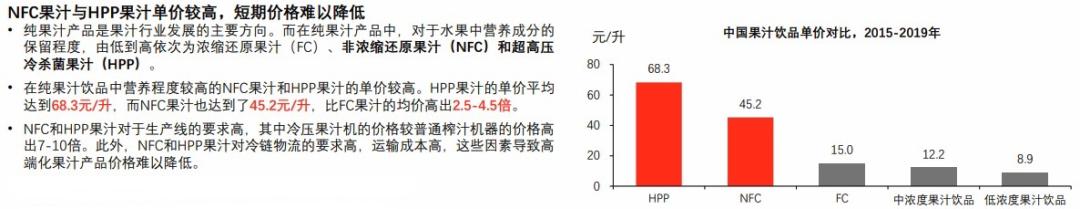 头豹研究院曾统计过,这三类果汁市场均价为:纯果汁15-68.3元/升、中浓度果汁12.2元/升、浓度果汁8.9元/升。
