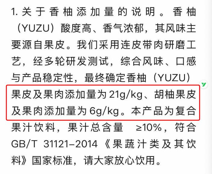 公司回应还提到,这2.7%的“柚子”,并不全是果肉,而是果皮与果肉混合物。