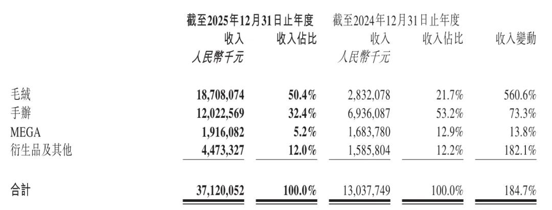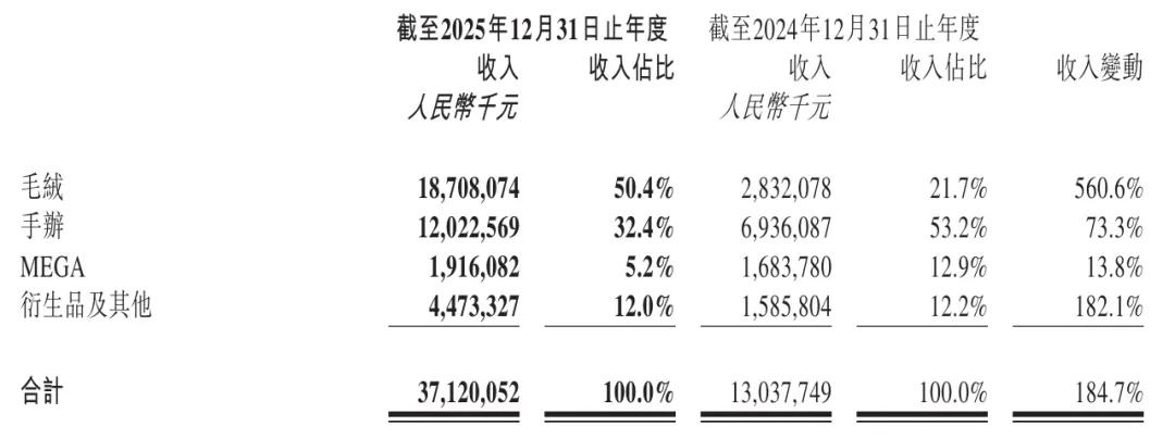 泡泡玛特2025年毛绒收入为187亿元,较上年同期的28.32亿元增长560.6%,占比为50.4%,首次成为公司收入占比最高的产品品类。