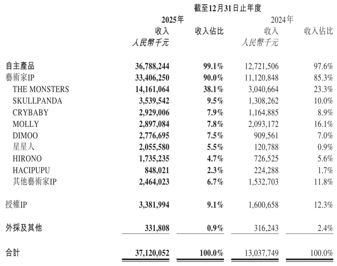 泡泡玛特LABUBU所在的THE MONSTERS在2025年营收为141.61亿元,较上年同期的30.41亿元增长366%,占营收的比例为38.1%。