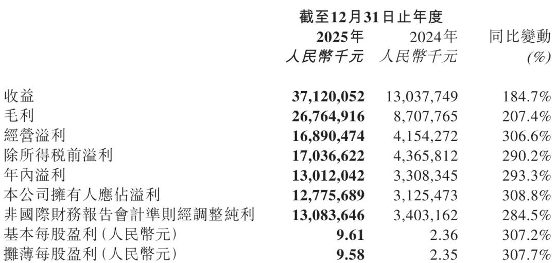 泡泡玛特2025年经营利润为168.9亿元,较上年同期的41.54亿元增长306.6%;年内利润为130亿元,较上年同期的33亿元增长293.3%;扣非后净利为130.84亿元,较上年同期的34亿元增长284.5%。
