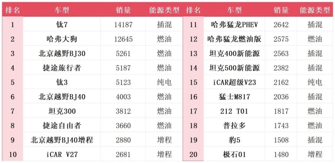 同样的“二八定律”,也在方盒子市场上演。3月方盒子销量TOP20中,仅有方程豹钛7、哈弗大狗两款车型销量过万;从第三名北京越野BJ30开始,销量直接腰斩至5261辆,腰部与尾部车型悬殊。