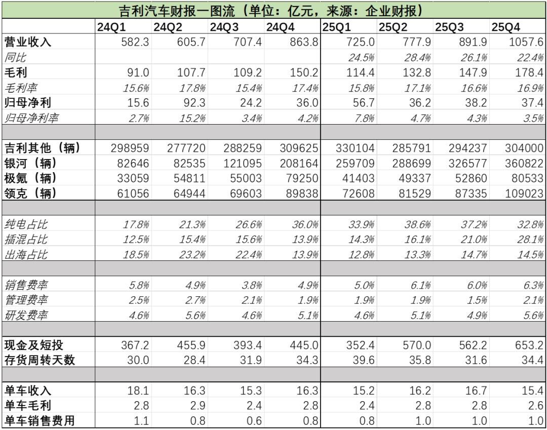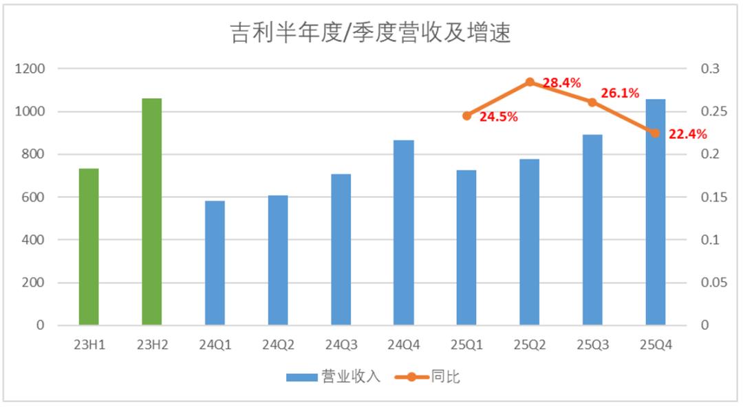 2025年吉利录得全年营收3452亿元,创历史新高,其中四季度录得1058亿元,同比增速达到了22.4%,为上市以来首次单季度营收破千亿元,仅从营收侧的表现来看,吉利2025年的答卷堪称完美。