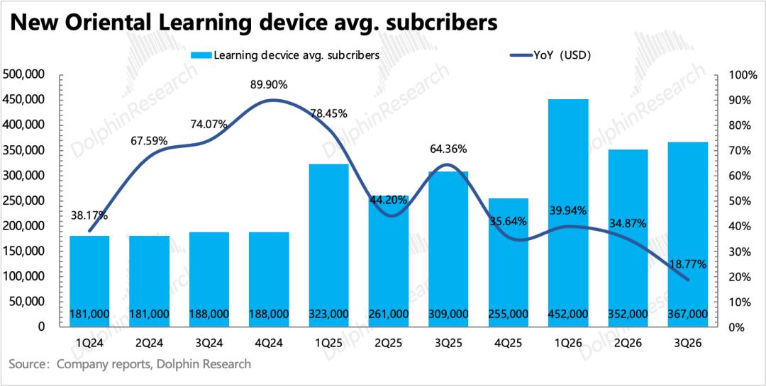 3)新业务:增速继续在汇率顺风的拉动下反弹至23%,符合预期。此前管理层交流,对2027财年15%-20%的增速比较有信心。细分业务上,素培得益于行业供给边际放缓,入学人次增速回暖(剔除春假波动影响,连续两个季度的增速来看,近三个季度基本持平);学习机竞争激烈也受AI影响较大,同行(比如好未来)都在降价促销。