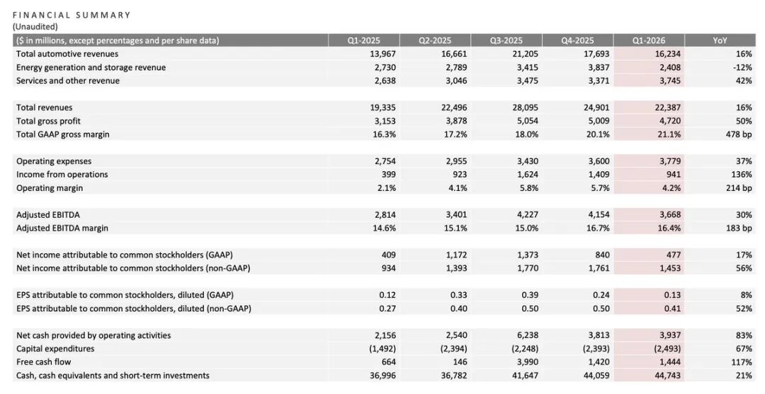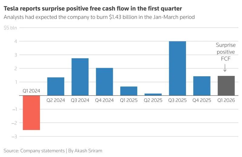 特斯拉一季度营收 223.9亿美元,低于市场预期的 226亿美元,这个本身不算惊喜。真正超预期的是自由现金流,公司做出了 14.4亿美元正值,而市场原本预期大约是 14.3亿美元流出。这说明,哪怕主业增长没有特别强,Tesla 依然具备先把现金流稳住的能力。这也是为什么财报刚出来的时候,股价第一反应是先往上冲。