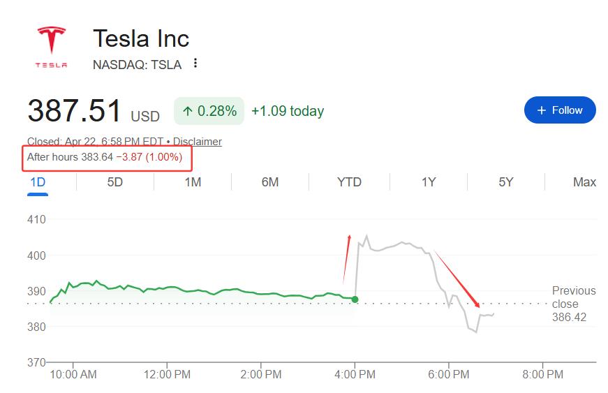 特斯拉一季报刚落地,股价一度跳涨4%,但是随后快速回落!