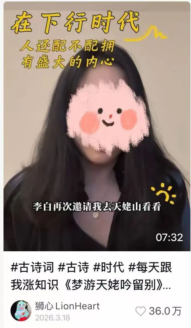 有一位叫@狮心LionHeart的博主,她在某社交媒体只有3.5万粉丝。但她半个月前发布了一则对《梦游天姥吟留别》的解读,却获得了34.7万点赞、6.7万转发。
