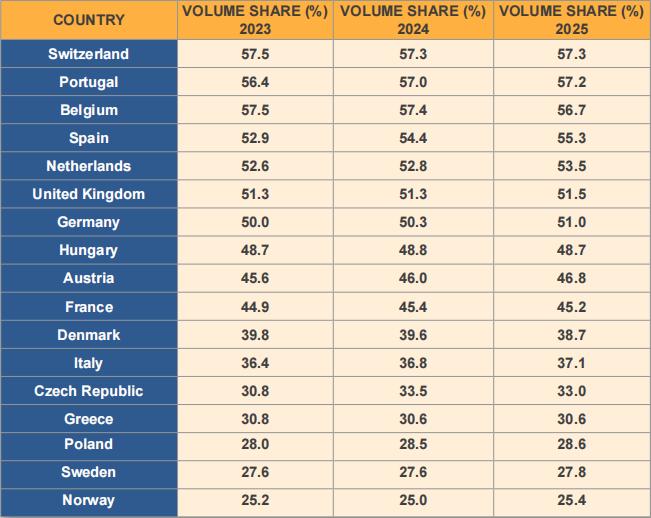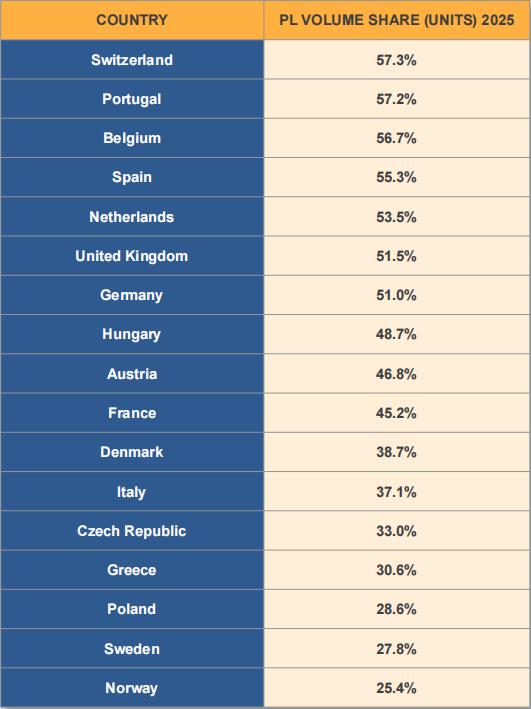 Private Label Volume Share (Units) by Country 2025(2025年欧洲17国自有品牌销量份额)