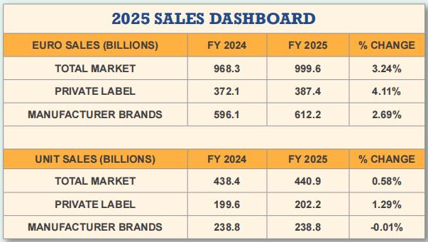 2025年,欧洲17国杂货市场整体价值增长3.24%,制造商品牌增长2.69%,自有品牌以4.11%的增速明显高于前两者。销量层面同样如此,自有品牌单位销量增长1.29%,而制造商品牌则几乎持平(-0.01%)。消费者不只是在账单上花了更多钱在自有品牌上,实际买回家的件数也在增加。