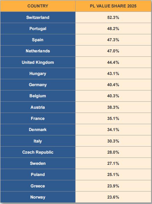 Private Label Value Share (Euro) by Country 2025(2025年欧洲17国自有品牌价值份额)