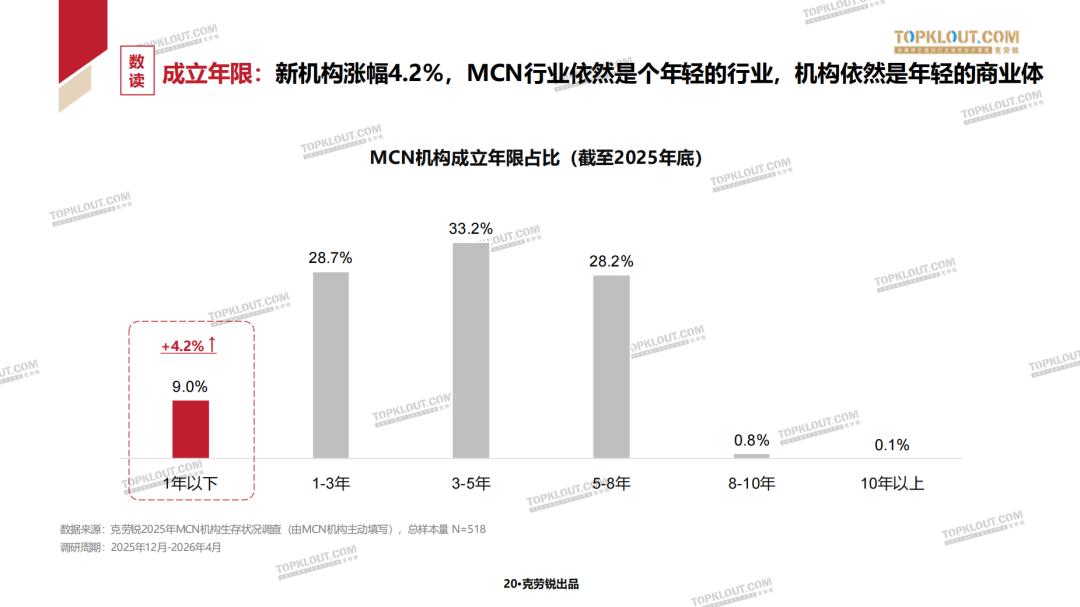 2.5%:2025年,中国MCN机构注册净数量同比增速降至2.5%,创十年新低,行业不再膨胀。