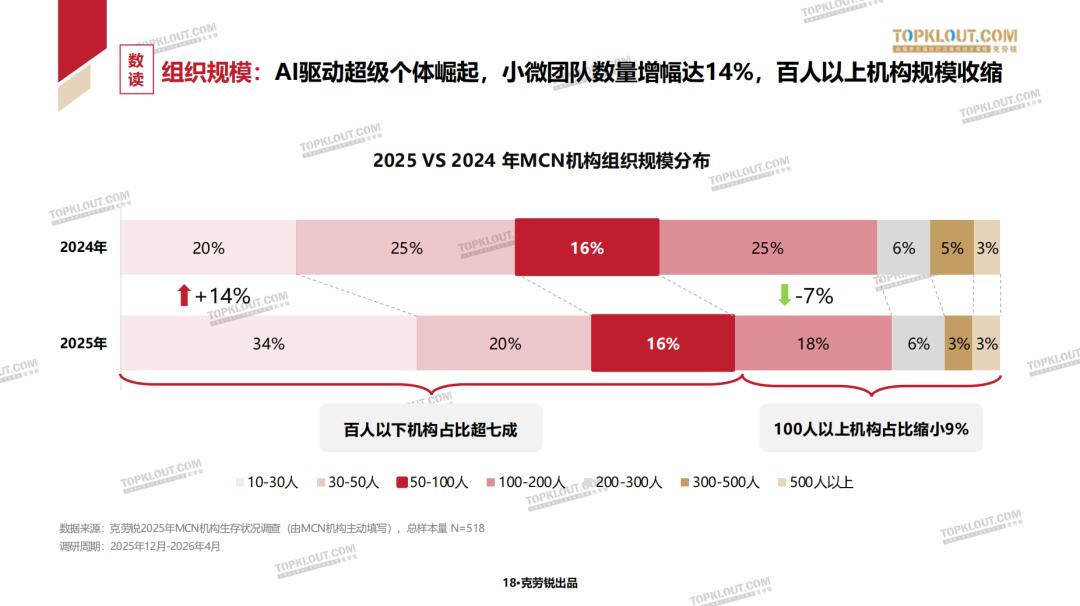 14%:小微团队逆势增长,增幅达14%,AI正在催生“超级个体”,百人以上机构规模收缩。