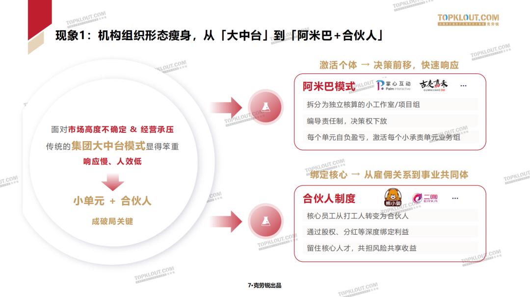 例如阿米巴+合伙人的机制。如今,传统的集团大中台模式被越来越多机构视为笨重,响应慢、人效低、决策链条长。取而代之的是独立核算的小工作室、项目组,决策权下放,每个小单元自负盈亏,核心员工也从打工人变成合伙人。
