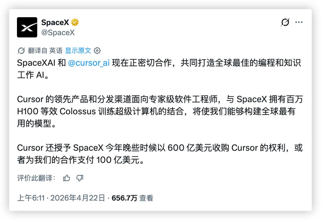 SpaceX 官方账号发推宣布与 Cursor 合作,称 Cursor 授予 SpaceX 以 600 亿美元收购 Cursor 的权利,浏览量 656.7 万。